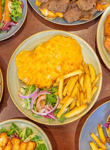 Chicken schnitzel topped with bacon, baby spinach and Camembert cheese lightly grilled and drizzled with a rose cream.